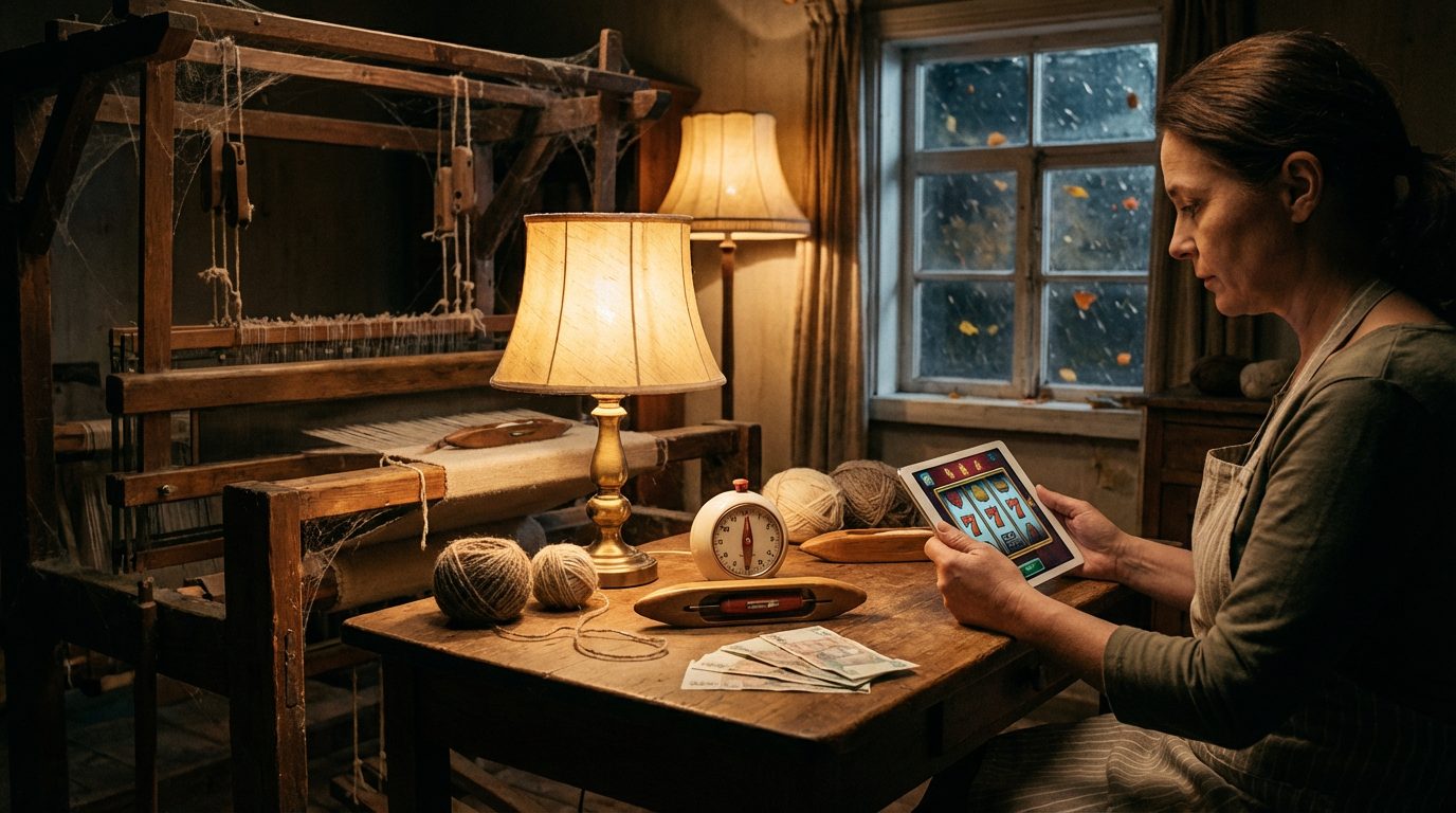 «Ночной Ткач». Спокойный слот: лампы, шерсть, холст. Бесплатные спины под стук педали.